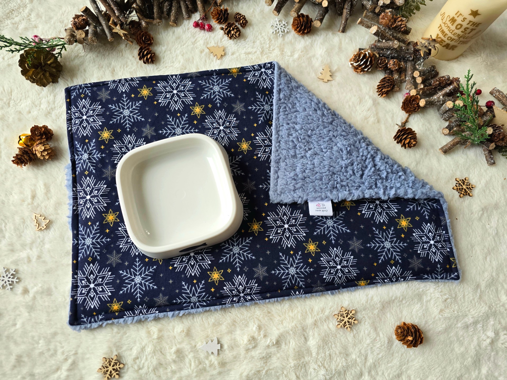 Tapis de gamelles réversible, une face coton, une face minky à pois toute douce. A l'intérieur un tissu imperméable pour ne jamais mouiller le sol