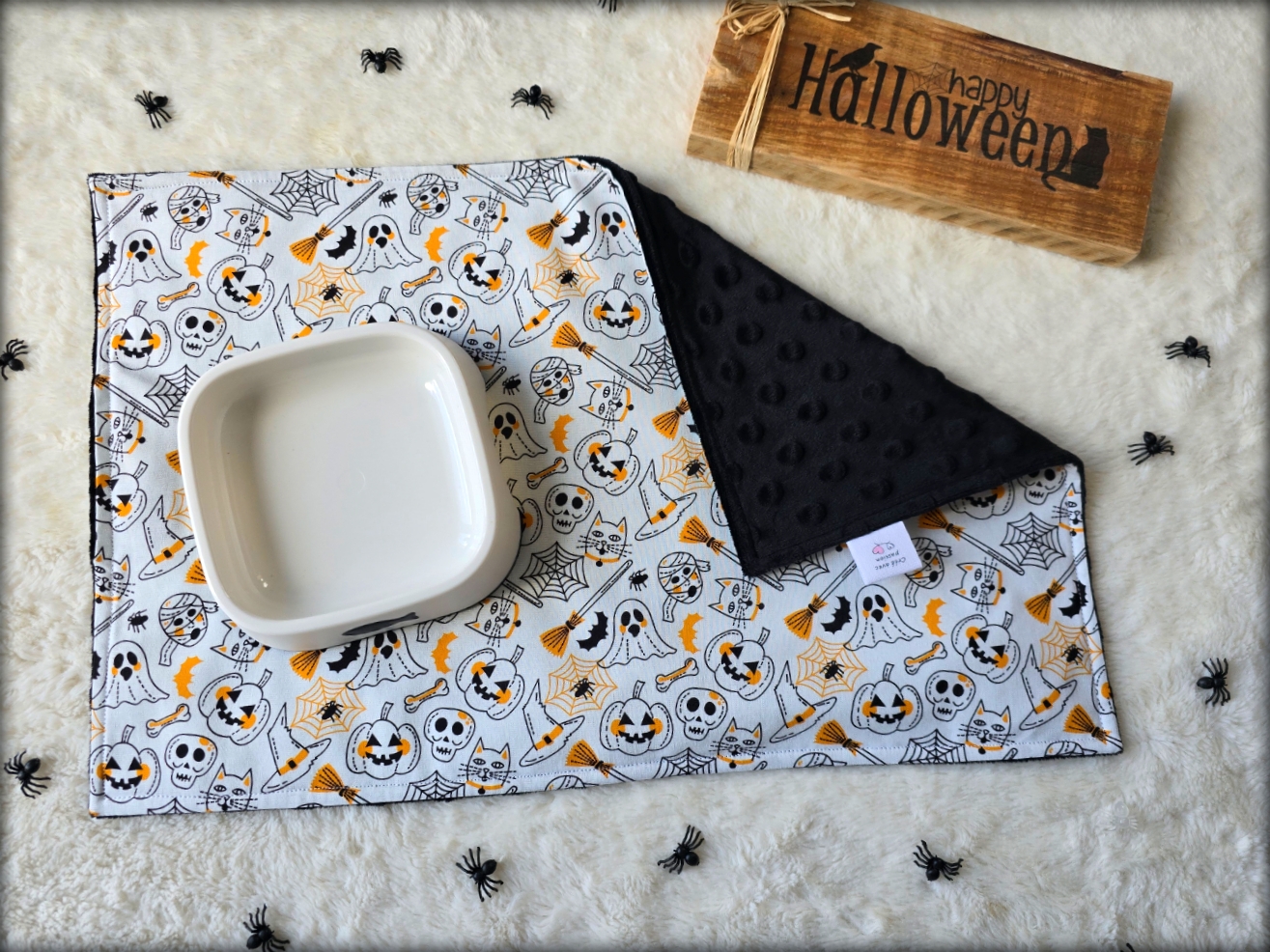 Tapis de gamelles réversible, une face coton, une face minky à pois toute douce. A l'intérieur un tissu imperméable pour ne jamais mouiller le sol